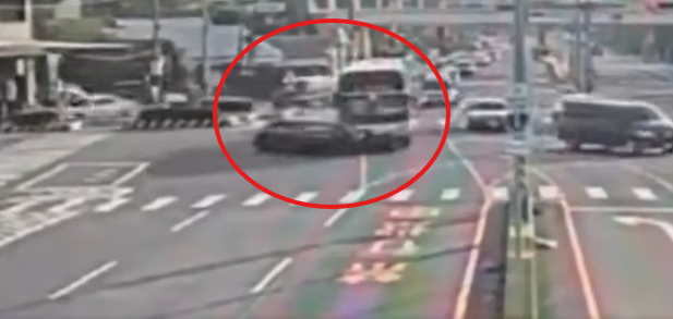 從監視器畫面可以看到,員林客運張姓司機沿著中山路三段直行往台中方向,同一時間柯姓駕駛開著轎車準備左轉進入金馬東路。兩車在路口交會時疑似未能即時反應,瞬間發生碰撞,轎車被撞擊後像陀螺一樣旋轉180度,右後車門和右後側車體嚴重凹陷破裂,外鈑金幾乎整片剝落,車門已經無法關閉明顯變形。