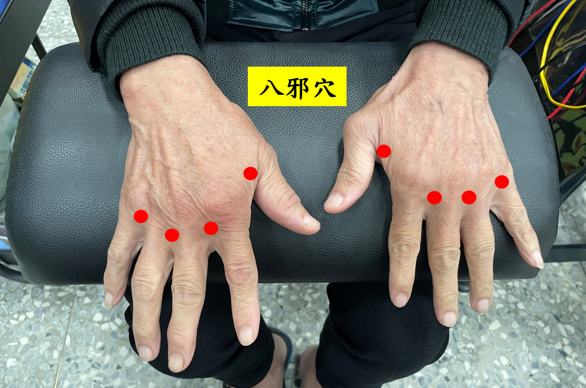 陳淑儀醫師指出,中醫將此病歸類為「痺症」、「頑痺」,認為是正氣不足,風、寒、濕、熱等邪氣侵入經絡,導致氣血運行不暢,痰瘀互結於關節,進而引發僵硬腫脹與疼痛。臨床上選用「八邪穴」作為主要治療穴位,該穴位位於手背第一至第五指間的指縫後方凹陷處,因可治療因邪氣所致的病症而得名。該穴位正好位於患處附近,能有效疏通經絡、促進血液循環,緩解關節腫脹與僵硬。