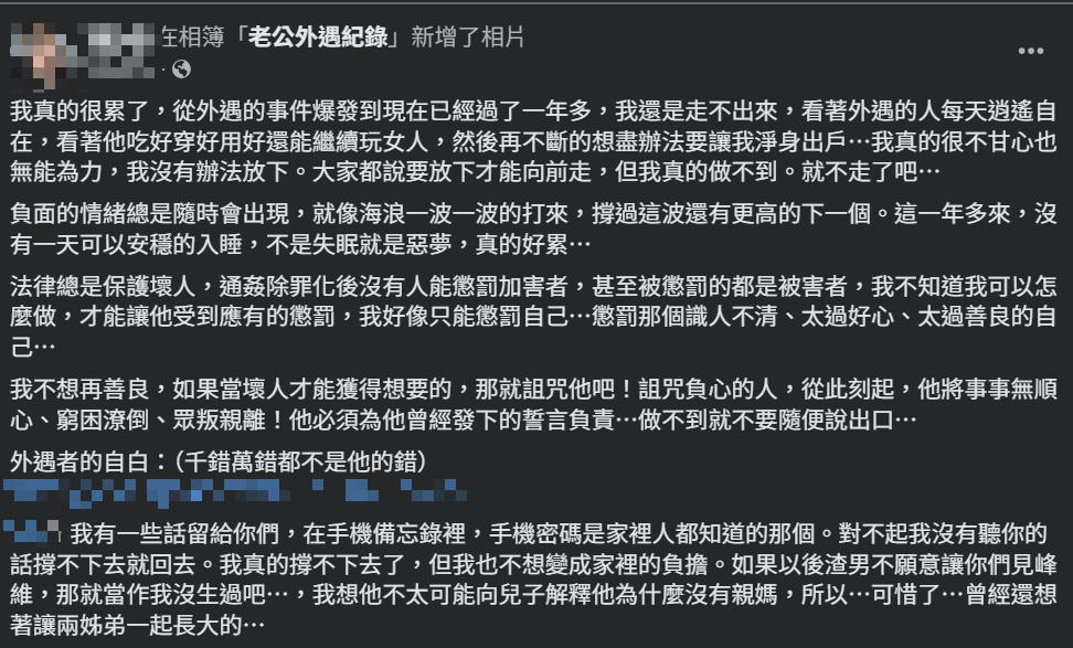 爆料民眾表示,近期家屬將其冤屈po在threads上,還PO出渣男自白的音檔,文章內容寫道:「姊姊離開了。她的配偶和外遇對象活了下來。她在懷孕期間及之後重度憂鬱近一年半的日子裡飽受被背叛的煎熬,穿上的紅色衣服、牆壁上留下的紅色字跡,都在發出無聲的吶喊。我不知道怎麼幫姊姊表達這些悔恨。要長期承受多巨大的痛苦才會用這樣的方式離開?在她最後的人生光景裡懷抱著的怨懟,大家總說死後要放下,才能安心地走。她的配偶絲毫沒想過讓她安心。而今的勸說終究是為了生者吧?她的心早已碎裂成模糊的樣子。」