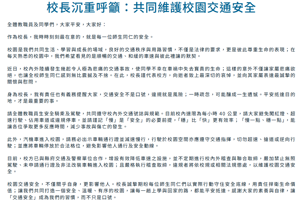 屏科大校長張金龍則在校內官網貼出公開信表示, 近日校內外陸續發生幾起令人極為悲痛的交通事故,使同學不幸在車禍中失去寶貴的生命;校長代表校方向逝者致上最深切的哀悼,並向其家屬表達最誠摯的關懷與慰問。身為校長,有責任也有義務提醒大家,交通安全不是口號,請全體教職員生安全騎乘及駕駛,共同遵守校內外交通號誌與規範。目前校內速限為40公里,請大家避免闖紅燈、超速行駛、佔用車道或違規停車。